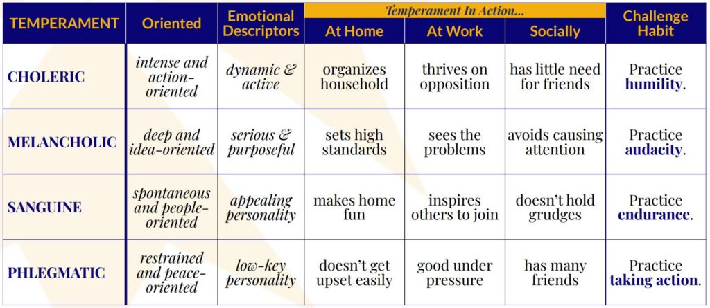 - Choleric – decisive, strong-willed, action-oriented
