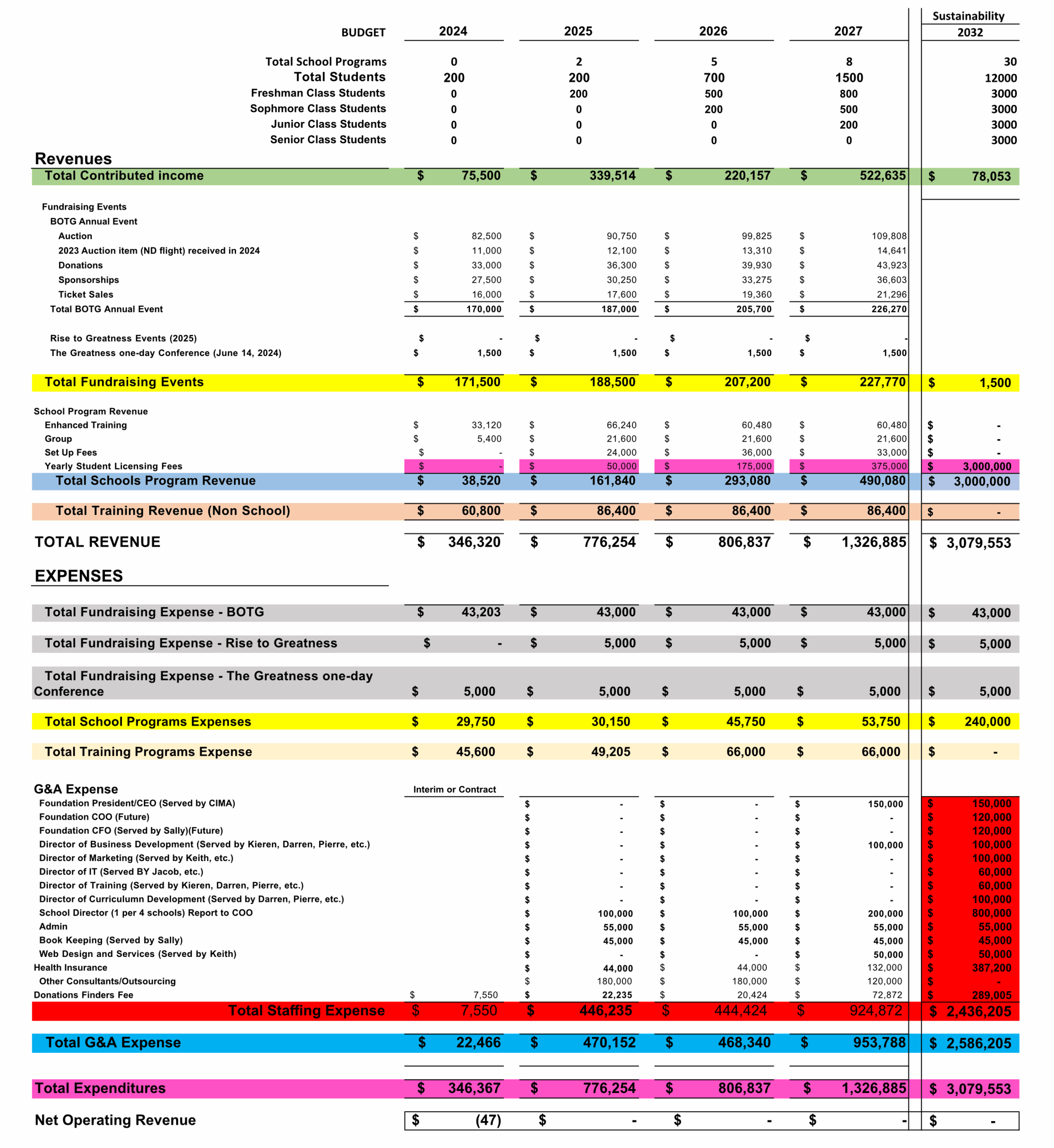 As referenced in the Budget Snapshot addendum, the Authentic Leadership Foundation’s financial roadmap demonstrates a deliberate progression from early-stage investment to full sustainability by 2032.