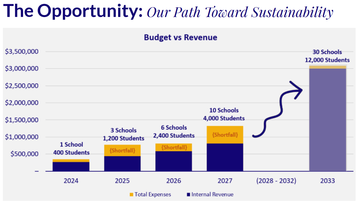 - Expansion from three schools in 2025 to 30 schools by 2032, with total student engagement growing from 200 in 2024 to 12,000 in 2032.